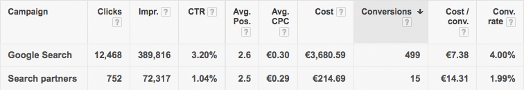 Wanneer je begint met adverteren in AdWords staat deze optie standaard aan, maar searchpartners zijn te deactiveren. Nadeel is echter dat searchpartners niet afzonderlijk geslecteerd kunnen worden. Aparte biedingen voor de searchpartners zijn dus niet mogelijk. Vervelend, want met grote regelmaat zie ik dat prestaties zeer verschillen zoals in onderstaand voorbeeld. De kosten per conversie zijn het dubbele van Google Search. Daarom wil ik per klik minder betalen om conversies rendabeler te maken.