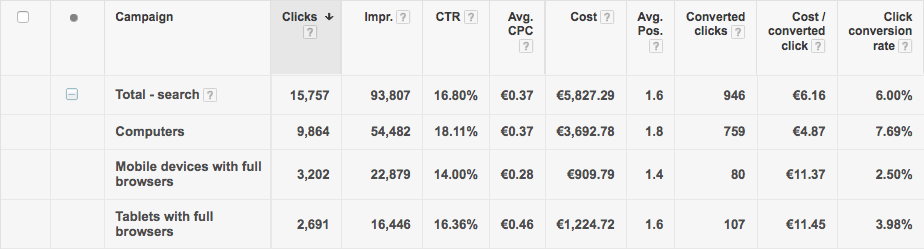 In 2011 maakte Google het mogelijk om tablet-specifiek te targeten. Hoognodig, want tablets wonnen flink aan marktaandeel en prestaties waren anders dan desktop/laptop en smartphone. Op 22 juni 2013 werden enhanced campaigns verplicht en daarmee verviel die mogelijkheid weer. De officiele verklaring van Google: “Tablet en desktop/laptop prestaties zijn nagenoeg gelijk”. Er was dus geen noodzaak voor aparte targeting. Officieel. In de praktijk blijkt het nog hoognodig, want soms presteert tablet beter en soms minder. In onderstaand bijvoorbeeld met fors hogere kosten per conversie.