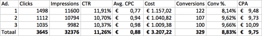 Wanneer gekozen wordt voor rotatie op basis van conversiepercentage zal advertentie 3 het meest vertoont worden. Kies je rotatie op basis van CTR dan zal advertentie 1 vooral zichtbaar zijn. Wenselijk, wanneer je zoveel mogelijk conversies wilt? Nee. Geen van beide! Indien advertentie 1 alle vertoningen op zich zou nemen, zou het aantal conversies 314 zijn. Advertentie 3 zou zorgen voor 324 conversies. Beide dus minder dan gelijkmatige rotatie.