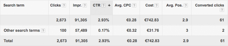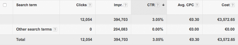 Om campagnes te optimaliseren, is de ‘see search terms’-mogelijkheid onmisbaar. Je kunt daar bekijken wat de exacte zoekopdrachten zijn bij vertoningen van jouw advertenties. Stel dat je op zoek bent naar woorden die irrelevante vertoningen veroorzaken. Je hoopt dit te vinden in het search term report. Data als onderstaand (search term overzicht van alle zoekwoorden in het account) is dan absoluut niet wenselijk!