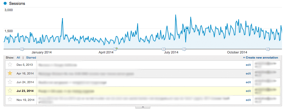 In AdWords is er de change history waarin je kunt zien wie wat en op welk moment heeft aangepast of toegevoegd. Handig, maar wanneer je aanpassingen wilt benchmarken vrij nutteloos. Wat ik graag zou zien, zijn noties zoals in Google Analytics. Dus een timeline waarin je notities kan toevoegen met opmerkingen. Daarbij zou het erg fijn zijn om ook voor/na data te kunnen vergelijken op basis van een wijzigingen in het account.