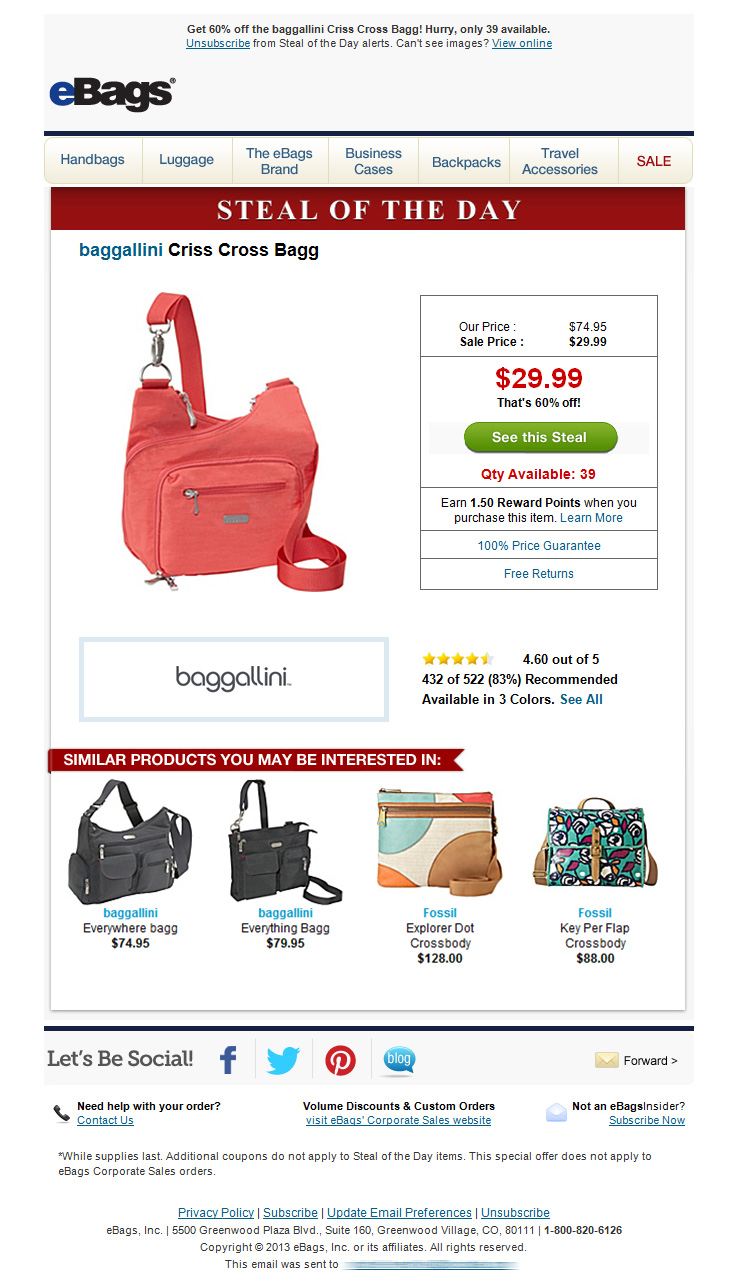 De Amerikaanse retailer eBags is gespecialiseerd in, je raadt het al, tassen. Het assortiment van eBags omvat meer dan 50.000 producten van ruim 550 merken. Toch hebben ze geen enkele tas op voorraad, eBags werkt volledig op basis van dropshipping. Sinds de lancering in maart 1999 verkocht eBags meer dan 18 miljoen tassen. Op de eCommerce Conference in Melbourne lichtte mede-oprichter Peter Cobb onlangs toe dat e-mailmarketing daarin een belangrijk aandeel heeft. Testen, meten, maar vooral creatief zijn: e-mailmarketing anno 2013.