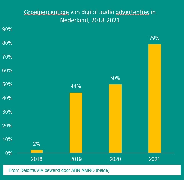 De podcast is aan een revolutionaire opmars bezig en adverteerders weten de podcast steeds vaker te vinden; zo blijkt uit de gezaghebbende Digital Ad Spend van Deloitte/VIA dat digital audio met 79 procent groeide in 2021 vooral vanwege podcast-advertenties. Ook wordt er flink geïnvesteerd in nieuwe podcast programma’s. Internationaal springt Spotify in het oog met grote investeringen. In Nederland heeft het Deense Podimo, dat het “Netflix” van de podcasts wil zijn, de markt betreden. Dit schrijft ABN Amro in zijn rapport ‘Stand van Technologie, Media en Telecom – oktober 2022’