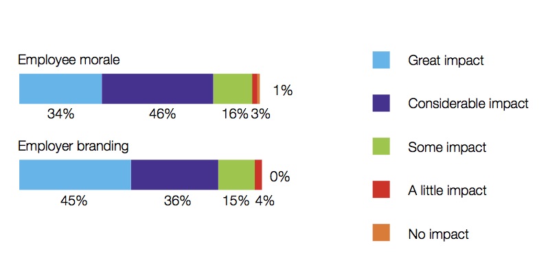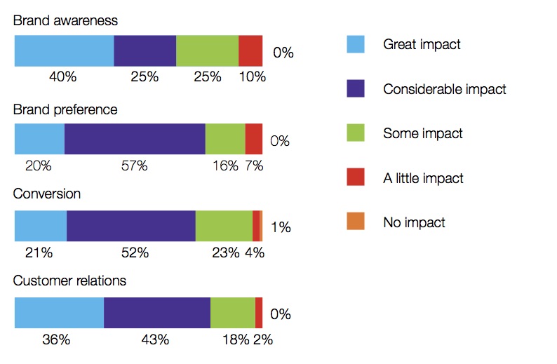 Wat valt op? Ook in 2015 geldt dat de impact van een bedrijfsblog hoog wordt ingeschat. Als je de antwoordcategorieën ‘great’, ‘considerable’ en ‘some impact’ samenvoegt, krijg je nergens minder dan 90 procent. Bloggen raakt dus alle facetten van je organisatie; of het nu gaat om (potentiële) klanten en werknemers of externe influencers.