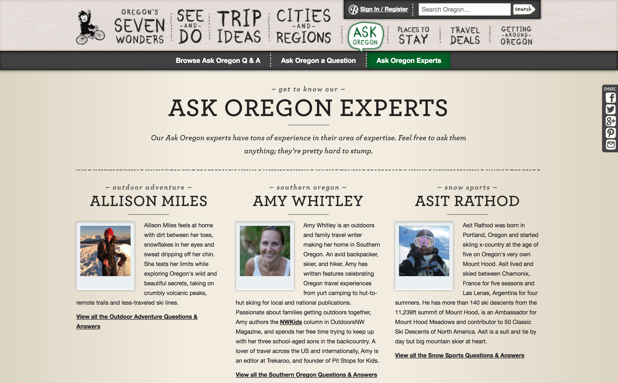Een ontzettend slimme toevoeging aan TravelOregon.com vind ik de ‘Ask Oregon’-sectie. Levendige FAQ’s waarbij je allerlei vragen kunt stellen aan lokale experts zoals Allison Miles (specialist in outdoor adventures), Jeff Alworth (specialist in bier) en Emily Palmer (specialist in Easter Oregon). Per thema/niche/regio van de staat is een gepassioneerde inwoner betrokken om jouw vragen te beantwoorden. Hiermee krijg je een authentiek antwoord op je vraag. Samen vormen alle experts een hechte community.
