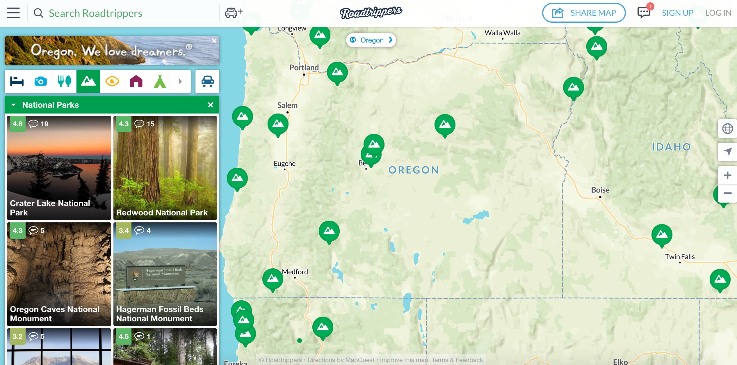 TravelOregon heeft bewust samenwerkingen opgezocht met bestaande infrastructuren als Roadtrippers.com (app om je roadtrip uit te stippelen), Fieldtrip en TripAdvisor. Waarom zelf het wiel uitvinden als er al tienduizenden installaties zijn in deze apps? Bij iedere point of interest, zoals ‘Tamástslikt Cultural Institute’, zie je direct de review op TripAdvisor en kun je de locatie toevoegen aan je Roadtrippers-account.