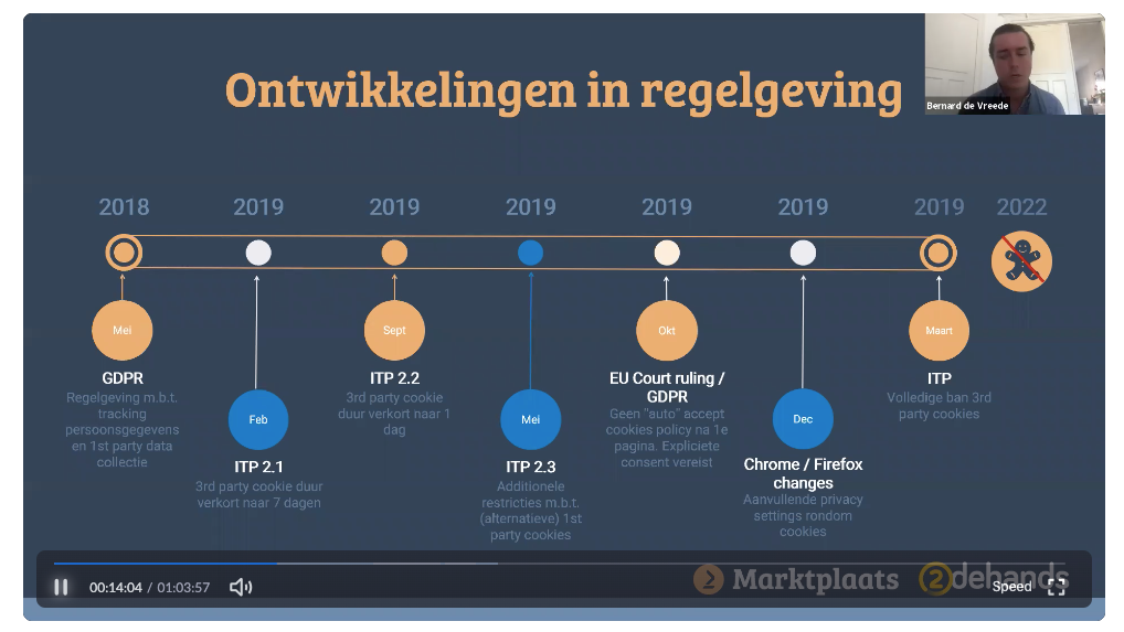 Hoe bereidt eBay/Marktplaats, dat zowel adverteerder als publisher is, zich voor op een cookieloze toekomst? Door vooral naar zichzelf te kijken en te focussen op de eigen doelgroep in plaats van de massa te volgen, vertelt Bernard de Vreede. En dat doen ze bij Marktplaats al jaren, want dat cookies en third party trackers eindig zijn, kan en mag voor niemand meer een verrassing zijn. Al sinds de introductie van de cookiewet en de AVG is Marktplaats bezig om nog transparanter richting de gebruikers te zijn over de data die het bedrijf van hen verzamelt. Zo legt het heel duidelijk uit waarom en zorgt het ervoor dat het dataverzamelen ook op een verantwoordelijke manier gebeurt.