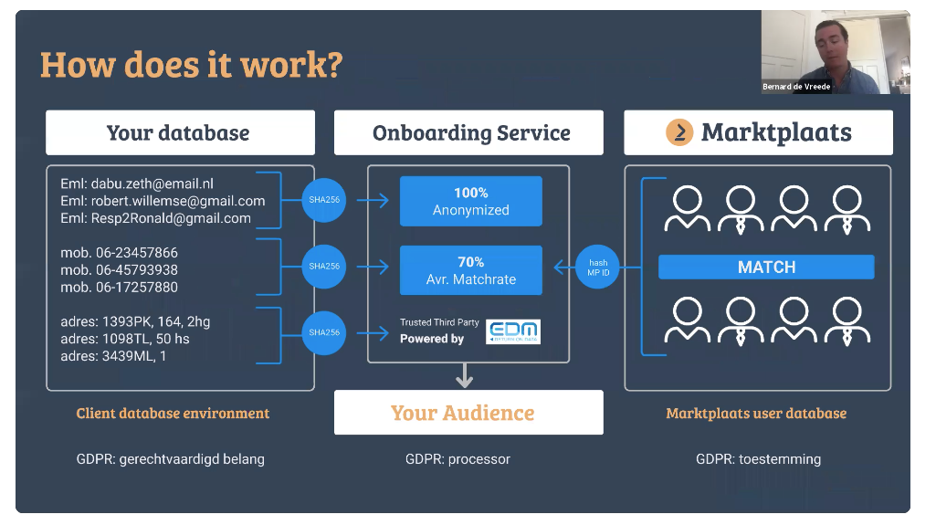 Door de juiste attributen in te zetten heeft Marktplaats inzichten verzameld waarmee het zijn eigen doelgroep nog beter kan schalen en segmenteren. Data die Marktplaats nu ook gemakkelijk en geanonimiseerd met anderen kan delen. Afgelopen februari is het dan ook een propositie gestart die vergelijkbaar is met Facebook Custom Audiences en Google Customer Match. In het kort houdt dit in dat het CRM-bestand van Marktplaats gekoppeld kan worden aan het CRM-bestand van bijvoorbeeld een adverteerder.