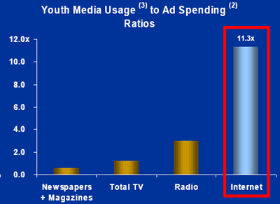 Verhouding mediagebruik jongeren vs advertentiebestedingen (uit: presentatie Mary Meeker, Morgan Stanley)