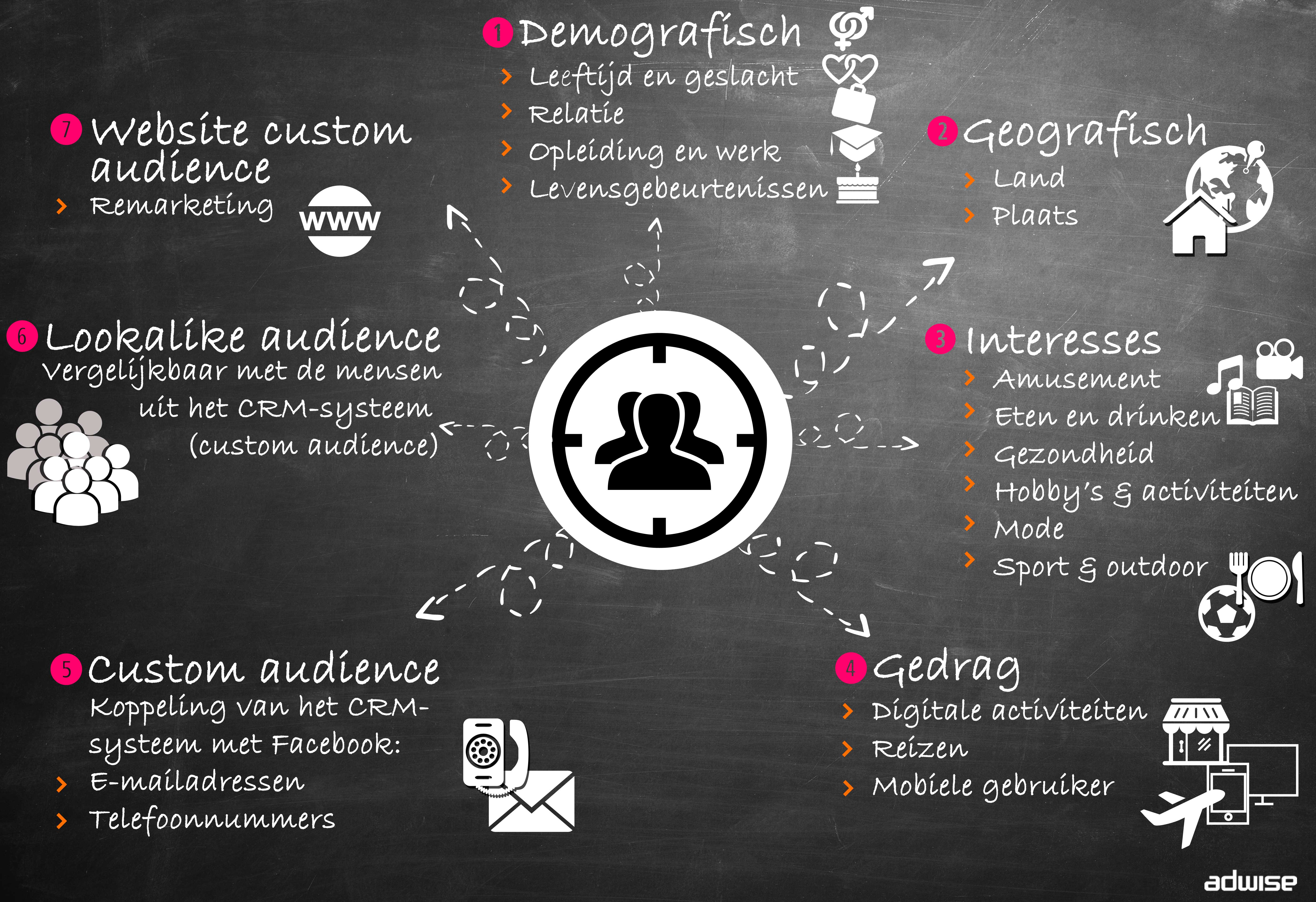 Facebook biedt adverteerders de mogelijkheid om ontzettend specifiek te targeten. Dit komt omdat elke Facebook-gebruiker erg veel informatie deelt met Facebook. Deze informatie kunnen adverteerders vervolgens gebruiken om hun doelgroep mee samen te stellen. Zo is niet alleen mogelijk om op demografische gegevens te targeten, maar ook op interesses en gedrag.