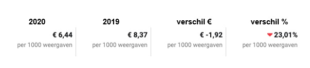 We zien dat we voor 1.000 vertoningen de afgelopen tijd een stuk minder hoeven te betalen. Ik werk als Online Advertising Specialist en ik zie ook bij veel van onze klanten een daling in kosten om 1.000 vertoningen te genereren. In 2019 betaalden we voor een van onze klanten gemiddeld nog 8,37 euro per 1000 weergaven, en in 2020 was dit nog maar 6,44 euro. Een mooie daling in kosten van 23,01 procent.