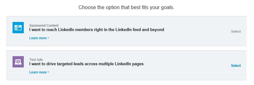 Tijd om het type campagne te kiezen. LinkedIn geeft je daarin – hoe overzichtelijk – twee keuzes. Kies je voor een Sponsored Content-campagne, dan bereik je je doelgroep via gesponsorde posts in hun LinkedIn-feed. Optie twee, de Text Ad, verschijnt als advertentie in de zijlijn of aan de bovenkant van LinkedIn-pagina’s.