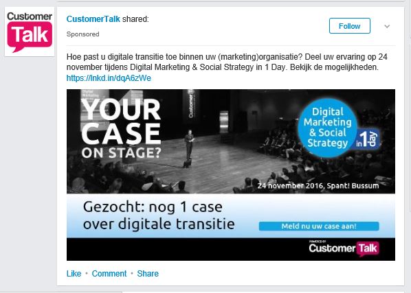 Valt mij op dat Linkedin erg duur is in vergelijk met FB en TW. Prijzen voor een click opzelfde doelgroep bijna dubbele prijzen, zeker in vergelijk met FB. Ze zouden onderscheid moeten maken tussen sponsored content en advertising. Ik betaal nu rond de 1,50/2 euro om een blogpost te laten lezen dat is te hoog naar mijn idee. 2 euro voor een landing op een salestraject prima. Komt bij dat met een beetje actief sharen door de collega’s ik zo op honderden euro’s bereik zit.