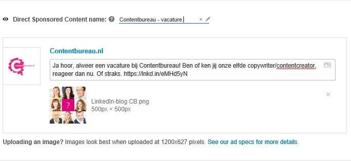 Naast de mogelijkheid om bestaande organische content te sponsoren, kun je ook nieuwe gesponsorde content creëren. Deze content verschijnt niet op je LinkedIn-pagina, maar enkel in je advertentiecampagnes. Het voordeel: je kunt meerdere advertentieversies en doelgroepen creëren om te testen welke advertentie het best werkt. Geef je post een naam – geen zorgen, die verschijnt niet boven je advertentie – schrijf een post van maximaal zeshonderd tekens en voeg een afbeelding toe. Moet dat? Niks moet, maar LinkedIn-posts met afbeeldingen krijgen zo’n twintig procent meer clicks.