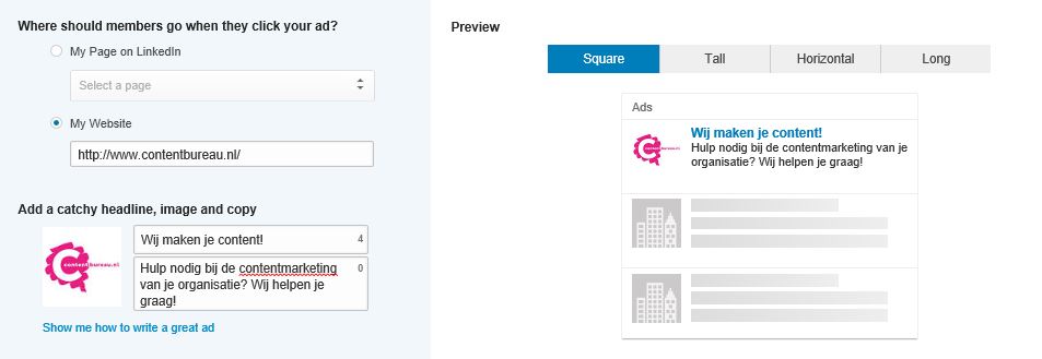 Hier heb je twee opties: moet je doelgroep doorklikken naar je LinkedIn-pagina of showcasepagina óf moet zij rechtstreeks naar je website worden geleid? Maak hierin een keuze en stel vervolgens een advertentie op. Kies voor een opvallende kop van maximaal 25 tekens, een omschrijving waarom iemand op jouw advertentie moet klikken (maximaal 75 tekens) en een afbeelding.