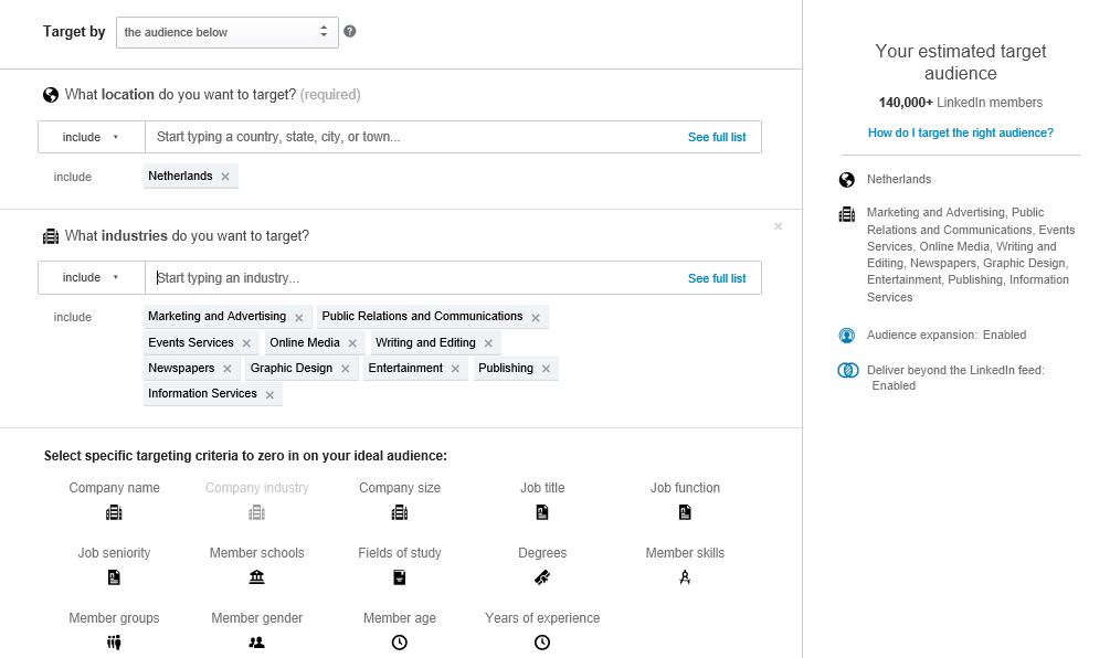 Door je advertenties te targeten, zorg je ervoor dat ze terechtkomen bij de relevante doelgroep. Target op land of stad, en op zaken als sector, bedrijfsgrootte, functie, niveau, diploma’s of leeftijd. Inderdaad, waar Facebook-advertising gericht is op interesses, richt LinkedIn-advertising zich vooral op professionele kenmerken van je doelgroep.