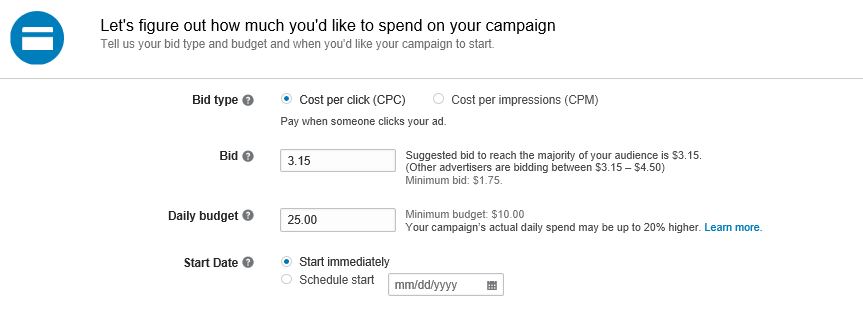 Handig is dat LinkedIn je een indicatie geeft van het bod van de CPC of CPM van concurrenten, zodat je weet hoeveel je minimaal moet bieden om de concurrentie bij te benen. Je hebt tevens de mogelijkheid om een maximaal dagbudget in te stellen – minimaal tien euro per dag – zodat je budget niet na één week op is. Let op: voer ook altijd een totaalbudget in voor je gehele campagne. LinkedIn-advertising is relatief duur en je wilt niet voor onverwachte kosten komen te staan.