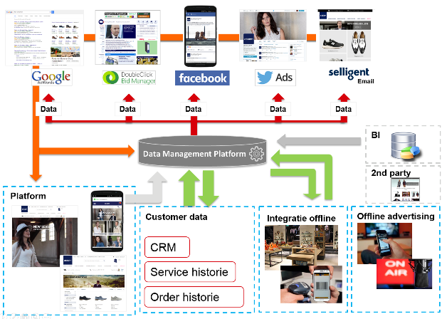 Deze gecombineerde data kunnen dan vervolgens ingezet worden voor het aanmaken van gesegmenteerde customer journeys ten behoeve van bijvoorbeeld de klantcontactstrategie. Door deze gecombineerde data kunnen deze journeys over meerdere kanalen zoals programmatic display, video, search, social advertising, de eigen website, e-mailmarketing, DM, SMS, etc. worden aangeboden. De interactiedata vanuit de kanalen – advertentie wel/niet aangeklikt, e-mail wel/niet geopend – is vervolgens weer keurig terug te leveren aan het DMP, zodat deze ook gecentraliseerd gebruikt kunnen worden.