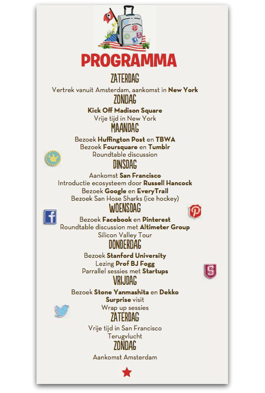 Het programma bestaat o.a. uit bezoeken aan gevestigde bedrijven als Facebook, tumblr, Huffington Post, foursquare, Google, twitter, Pinterest en Stanford University. Maar ook partijen als Dekko en Everytrail staan op het programma, start-ups die in Nederland nog niet zo bekend zijn. Zie ook het programma hieronder.