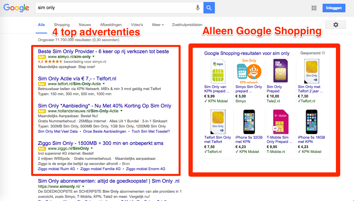 De andere uitzondering voor advertenties in de rechterkolom is Google Shopping. Doordat deze advertenties nu niet afgeleid worden door tekstadvertenties eronder, vallen deze producten meer op.