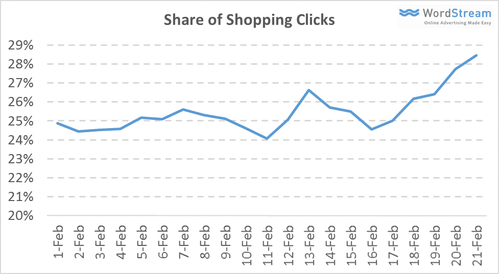 En dat lijkt goed te zijn voor de performance van Google Shopping: de eerste cijfers laten een stijging voor Google Shopping zien. Zowel de CTR op shopping advertenties als het aandeel van advertentieklikken stijgt de laatste dagen.