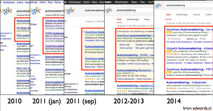 Het effect van stijgende CPC’s wordt dus versterkt, omdat er vanaf nu niet meer elf maar in totaal maximaal zes of zeven advertenties op pagina een van Google’s zoekresultaten staan.