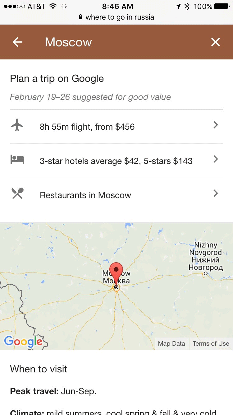 Een voorbeeld van hoe ver Google hierin wil gaan, is een recente test in de mobiele zoekresultaten bij het oriënteren voor een reis. Daarin zie je dat Google het grootste gedeelte van oriëntatie tot en met de boeking binnen de Google omgeving wil houden.
