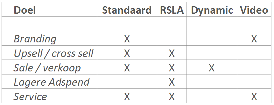 Het retargeten van websitebezoekers blijft een effectief targetingmiddel. Raoul Lemoine (Orangevalley) bespreekt tijdens zijn sessie het onderscheid tussen standaard remarketing, remarketing lists for search ads, dynamic remarketing en remarketing in YouTube & video. Het gebruik van het type remarketing hangt af van diverse marketingdoeleinden, zoals branding, up-sell/cross-sell, sales/verkoop, lagere advertentie-uitgaven en service. In onderstaande matrix is een handig overzicht gegeven hiervan: