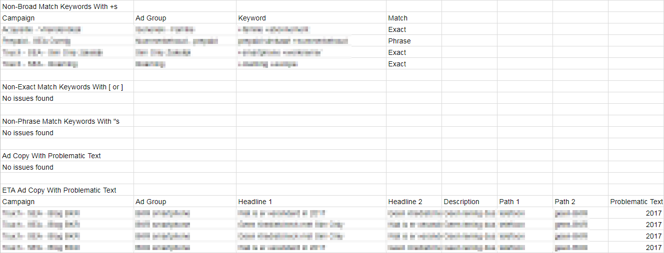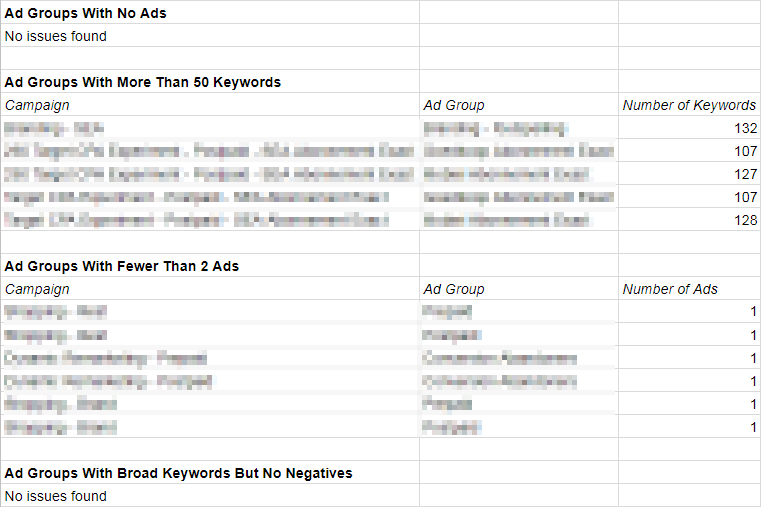 Naast het opsporen van ‘echte’ fouten – het ontbreken van zoekwoorden of advertenties – loopt het script dus ook een aantal best practice zaken na, zoals teveel zoekwoorden of te weinig advertenties in de advertentiegroepen.