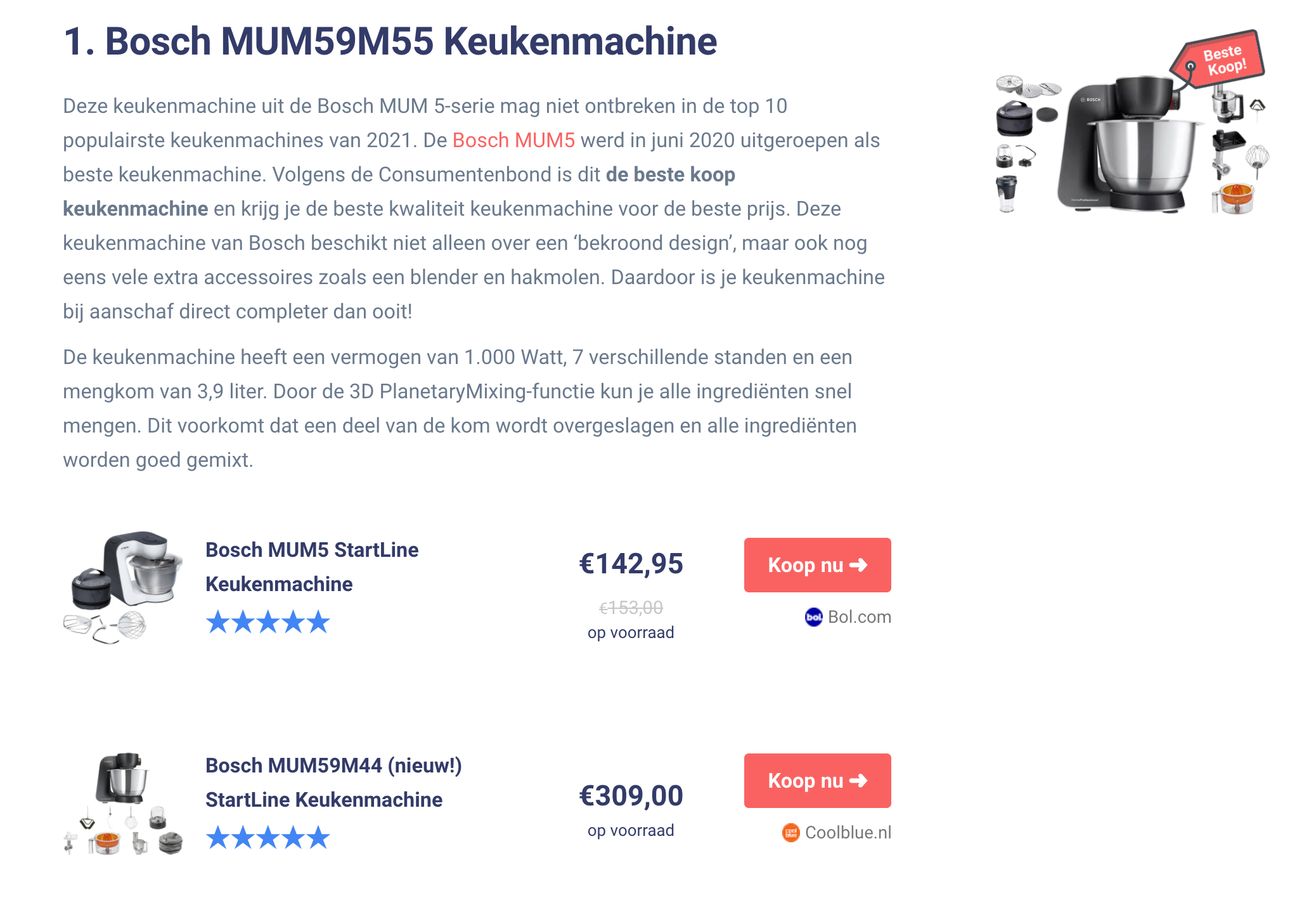 Nu je een goed onderwerp hebt bedacht en een lijst met focuszoekwoorden hebt, is de volgende stap content schrijven. Probeer zeker vijf tot tien pagina’s te schrijven voordat je live gaat met je website. Voor mijn eerste affiliate website De Beste Keukenmachine, schreef ik bijvoorbeeld: