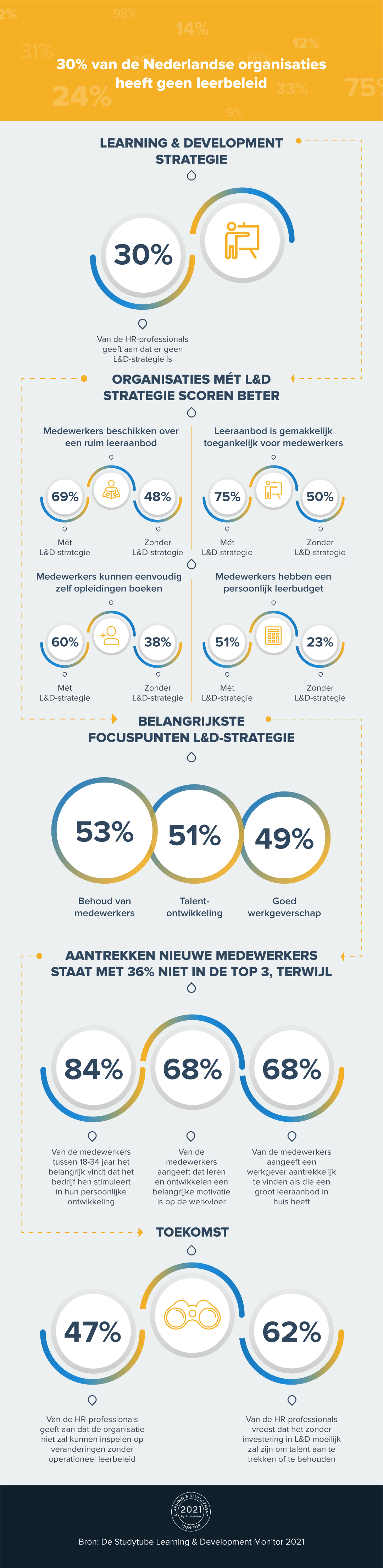 Bij bijna een derde (30 procent) van de Nederlandse bedrijven met meer dan 200 werknemers geven HR-verantwoordelijken aan dat er geen duidelijke strategie is voor de ontwikkeling van hun personeel. Wie wél een leer- en ontwikkelbeleid voert, laat belangrijke kansen liggen op het gebied van employer branding en werving & selectie van met name jongeren. Dat visten we vanmorgen uit een persbericht naar aanleiding van de Studytube Learning & Development Monitor 2021, een jaarlijks onderzoek dat Motivaction/Sparkey uitvoert voor Studytube.