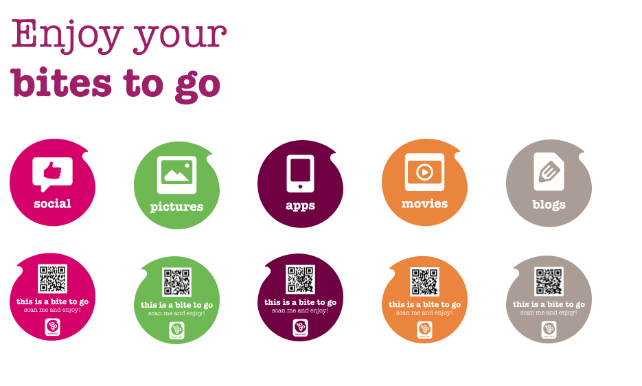 Dit laatste is mogelijk door een QR code te scannen waarna je mee wordt genomen naar een mobiele site: Bites to go. Hier vind je elke dag weer een nieuw filmpje, een leuke blog of een foto die een glimlach op je gezicht tovert en de vaak oneindige NS-trip wat verzacht.