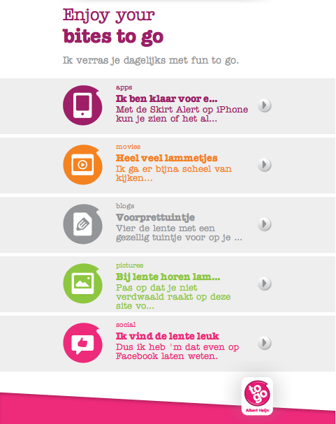 Ook op social media is het mogelijk om bedolven te worden onder de laatste nieuwtjes van het Ahold concern. Zowel op Facebook, Pinterest en Twitter is Albert Heijn to go te vinden. Op de vernieuwde mobiele website wordt het speelse karakter van de Bites doorgetrokken en hier kun je allerhande (woordspeling, inderdaad) informatie vinden over de, tot nu toe nog enige, winkel. Deze winkel kun je vinden op het Zuidplein in Amsterdam, waar hij afgelopen maandag geopend is. Mocht je er binnenkort langs lopen, dan kun je genieten van gratis wifi.