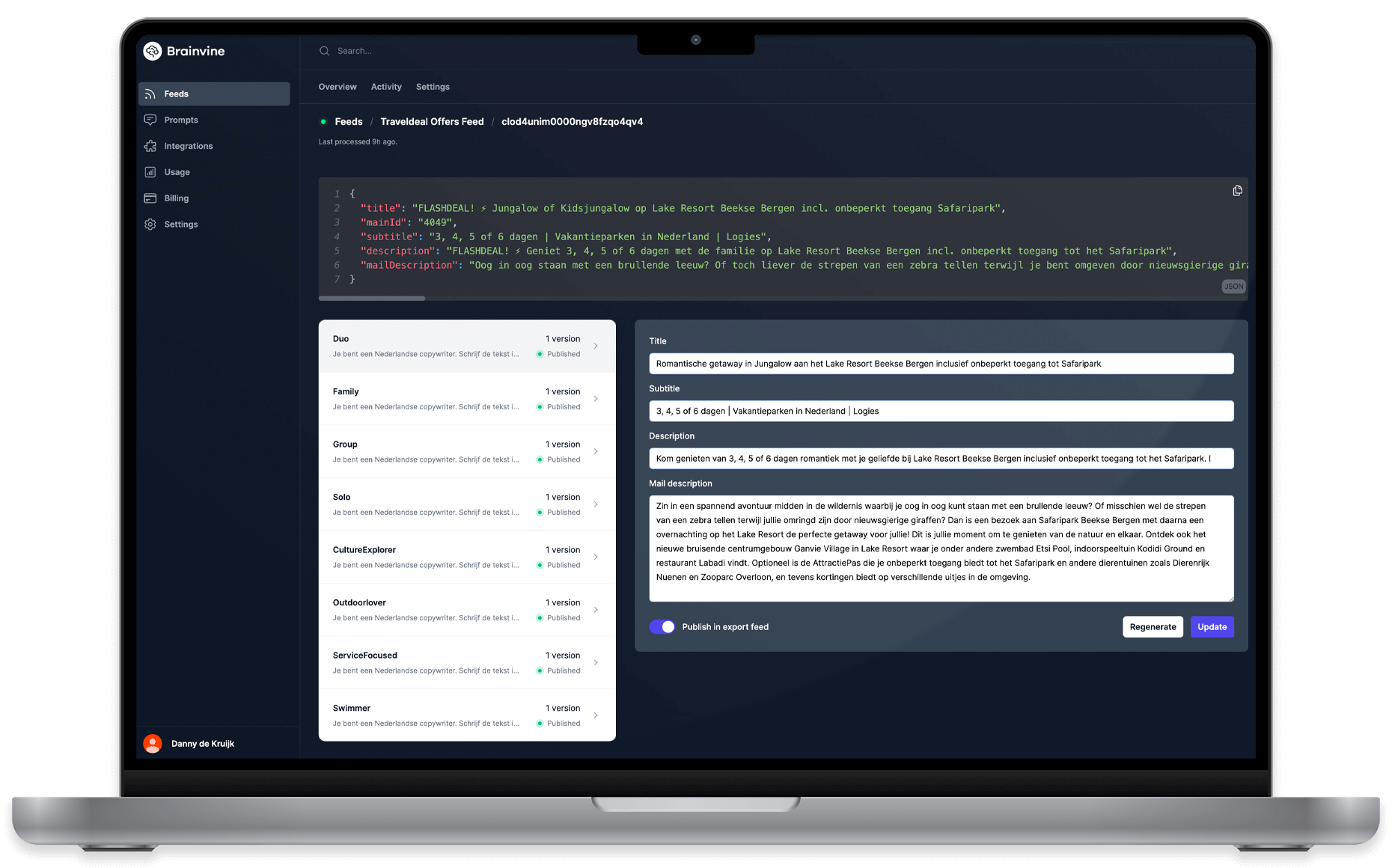 Wil je ook de magie van Brainvine feeds ervaren? Het is een fantastische tool en een supercharger van je CDP. Brainvine feeds helpt je teksten op schaal te personaliseren. Of je nu in de reisbranche zit zoals TravelDeal, of in de e-commerce, Brainvine feeds is ontworpen om je feed te configureren en naadloos te integreren met je CDP. Dus, waar wacht je nog op? Voor TravelDeal werkt het als een zonnetje; de conversies vliegen door het dak. We zijn het bij andere klanten aan het uitrollen. Dit is jouw kans om voorop te lopen in de toekomst van online shopping.