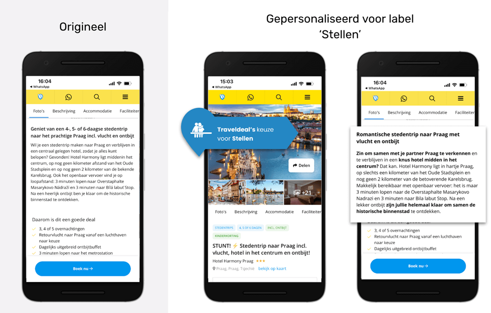 Hoe passen we hyperpersonalisatie toe op grote schaal? Door online gedrag bij Traveldeal te analyseren, verzamelen we veel informatie. Met AI optimaliseren we deze data voor hyperpersonalisatie. In een CDP maakt Traveldeal slimme segment labels aan zoals ‘solo’, ‘stellen’, ‘groepen’, ‘families’, ‘sport’ en ‘cultuur’, die worden toegewezen door een slim algoritme dat verschillende factoren meeweegt zoals klikgedrag op de site en eerdere boekingen. Met OpenAI hebben we pilots gedraaid om prompts aan te passen op basis van deze slimme labels. Zo hebben we accommodatiepagina’s volledig laten herschrijven voor bijvoorbeeld stellen of families, waardoor de content veel relevanter wordt voor de bezoeker.