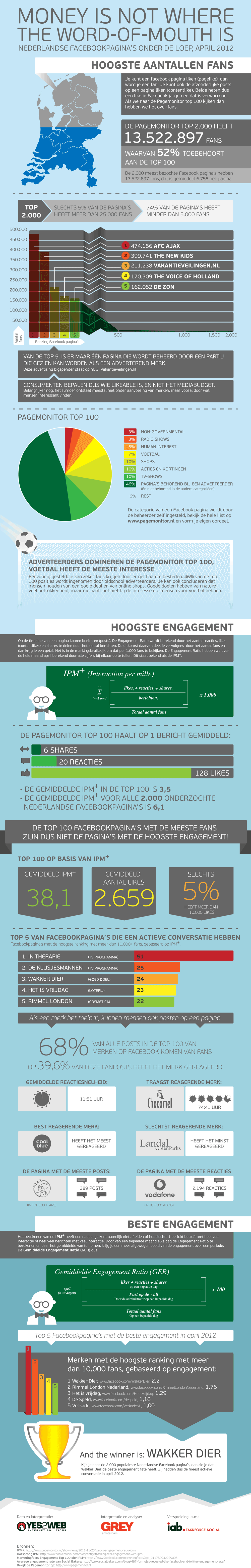 Met een half miljoen fans heeft Ajax veruit de populairste Nederlandstalige pagina op Facebook. De activisten van Wakker Dier hebben de beste interactie met hun volgers. Dat blijkt uit onderzoek onder de 2.000 grootste Facebook fanpagina's, uitgevoerd door Yes2Web en Grey Amsterdam in april 2012. Ook cosmeticabedrijf Rimmel London Nederland en loterij ‘Het is vrijdag' hebben veel en actief contact met hun digitale achterban.