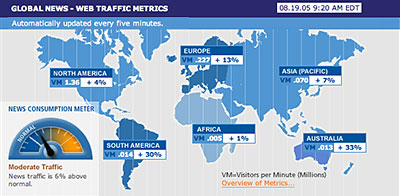 Webcontent distributeur Akamai houdt de wereldwijde nieuwsconsumptie bij, met elke 5 minuten een actualisatie.