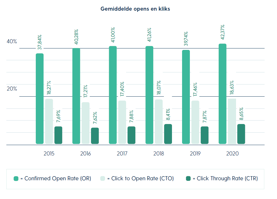 Het is wel goed om in de gaten te houden dat de Confirmed Open Rate (COR) van 42,37 procent echt een gemiddelde is van alle onderzochte 24 branches. De verschillen tussen branches zijn soms groot. Als voorbeeld: werk je in de branche Goede Doelen dan kun je met een COR van rond de 42 procent niet tevreden zijn. Het gemiddelde ligt binnen die branche eerder rond de 54 procent, maar werk je in de e-commerce dan zul je met een COR van 42 procent een gat in de lucht springen. Het gemiddelde in de e-commerce komt namelijk uit op 26 procent. Wil je voor je eigen e-mailmarketing een goed beeld krijgen, dan is het verstandig om de benchmark erbij te pakken.