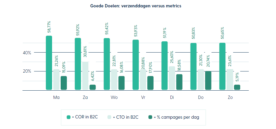 In de branche Goede Doelen worden de meeste e-mailcampagnes – ingezoomd op de B2C – inderdaad verstuurd op donderdag (20,74 procent) en op dinsdag (18,58 procent). Wat best opmerkelijk is omdat de campagnes die op maandagen en zaterdagen worden verstuurd veel betere ratio’s laten zien. Zo is de klikratio op zaterdag 30,81 procent en op de populaire verzenddag donderdag slechts 21,30 procent. En dat verschil is best groot. Voor de marketeers in deze branche is het helemaal niet gek om ook eens te onderzoeken of de maandag of de zaterdag aantrekkelijke verzenddagen zijn voor hun achterban.