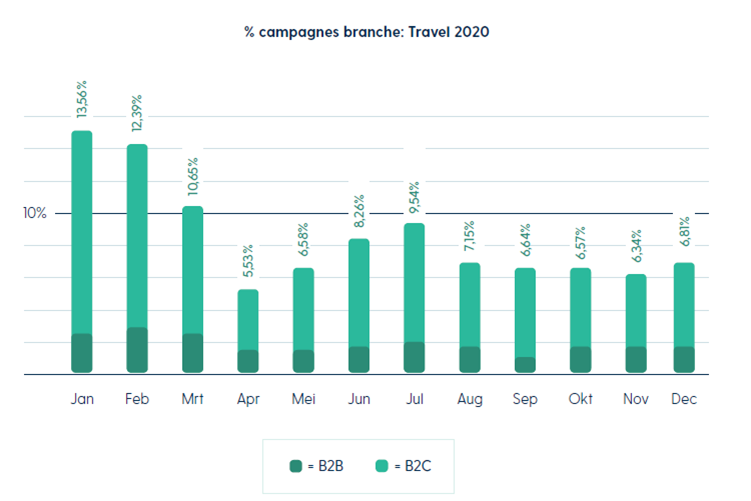 Als je bijvoorbeeld kijkt hoe in de branche Travel de campagnes over 2020 zijn verdeeld dan zie je direct dat de reisbranche na maart 2020 op adem moest komen na de ingrijpende overheidsmaatregelen en dat de zomer een kleine opleving liet zien toen er weer iets meer mogelijk was. Maar ook de tweede virusgolf na de zomermaanden zie je terug in de grafiek.