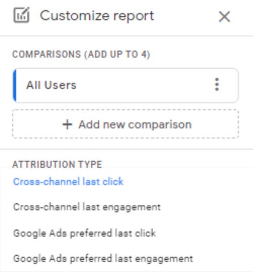 Nieuw binnen App + Web is dat je in ieder rapport het attributiemodel kunt selecteren waarmee de data in een rapport moeten worden gepresenteerd. Standaard is Analytics ingesteld op last-click, maar als voor jouw business of use case ‘last-engagement’ een relevanter attributiemodel is, dan kun je dat hier selecteren. Het is de verwachting dat meer attributiemodellen in de toekomst toegevoegd zullen worden.