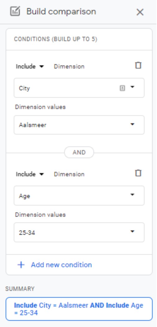 Binnen App + Web kun je net als in UA verschillende gebruikerssegmenten (audiences) met elkaar vergelijken. Dit is bij ieder rapport in App + Web mogelijk en kun je doen door op de ‘add comparison’-button te klikken. Je kunt vergelijkingen maken tussen dimensies of bepaalde audiences die je geconfigureerd hebt. Op dit moment is het mogelijk om vier segmenten tegelijkertijd met elkaar te vergelijken.