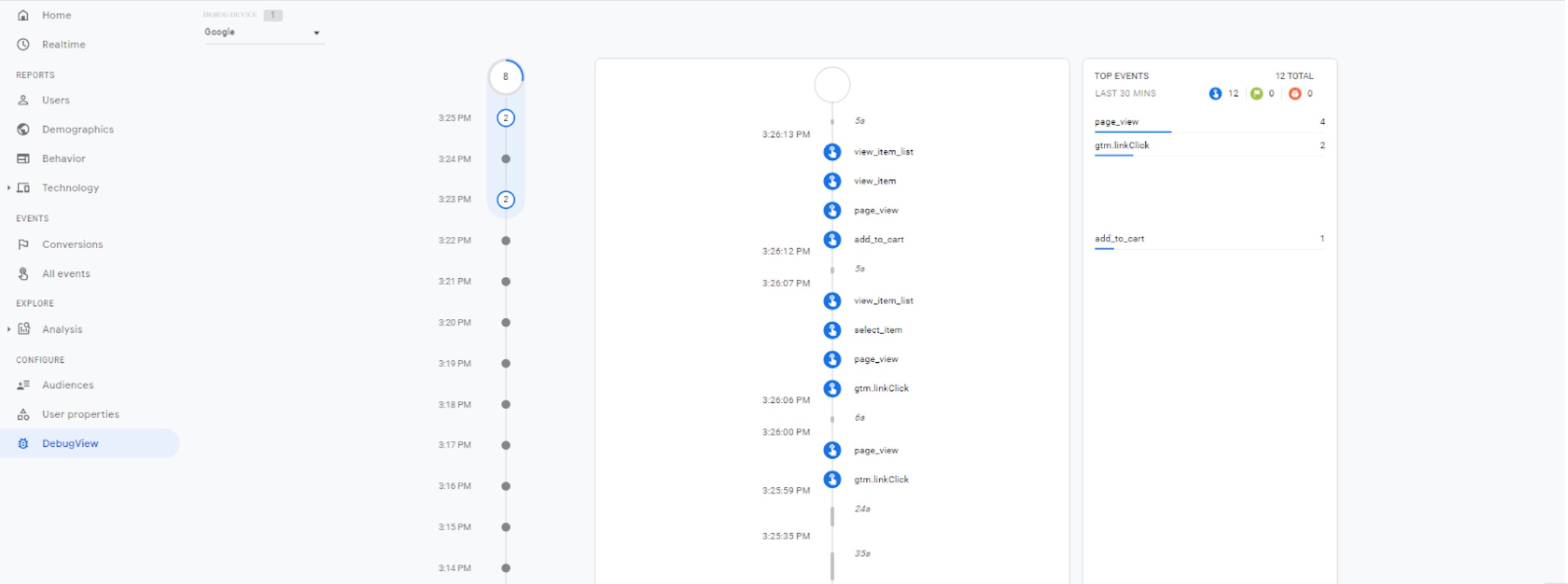 Net als in UA, heeft App + Web een rapport waar je in real-time kunt zien wat er nú gebeurt op je website. Het rapport is in App + Web een stuk vereenvoudigd en de verschillende sub-rapporten die we kennen van Universal Analytics zijn samengevoegd in één rapport. Daarnaast is het real-time rapport in App + Web een stuk uitgebreider dan in UA en zijn er meer mogelijkheden om je realtime data te filteren en audiences (segmenten) met elkaar te vergelijken. Dat is handig als je bijvoorbeeld net een nieuwe campagne gelanceerd hebt en de performance van de bezoekers uit je campagne wilt vergelijken met reguliere bezoekers. Verder kan je met de User Snapshot View, bekend van Firebase, een willekeurige gebruiker volgen op je website of app.
