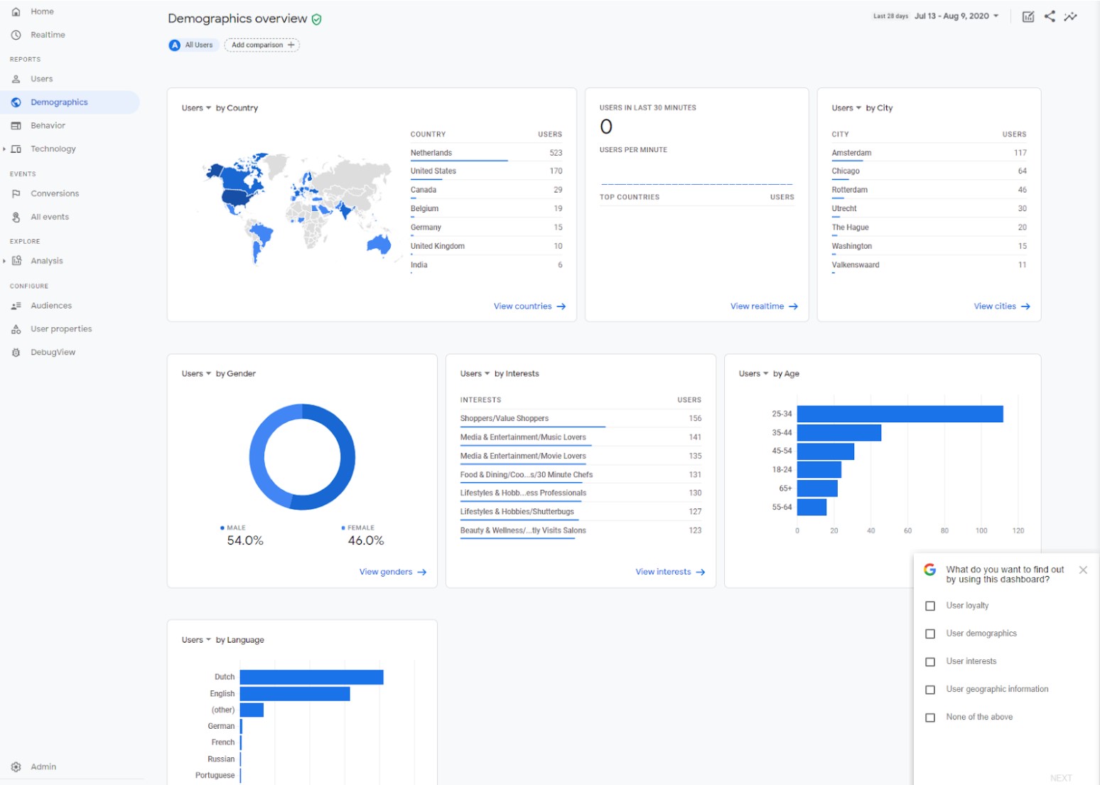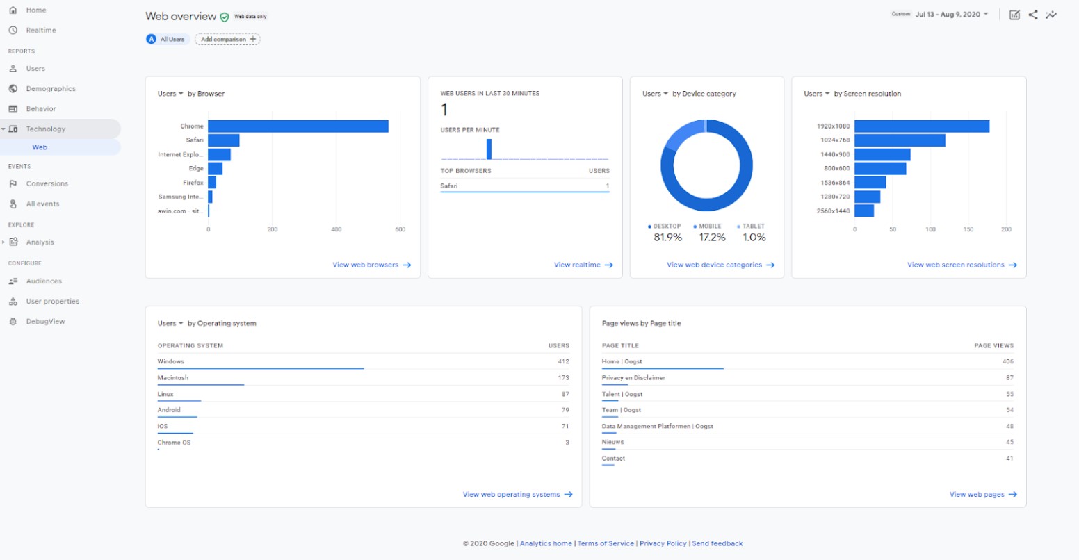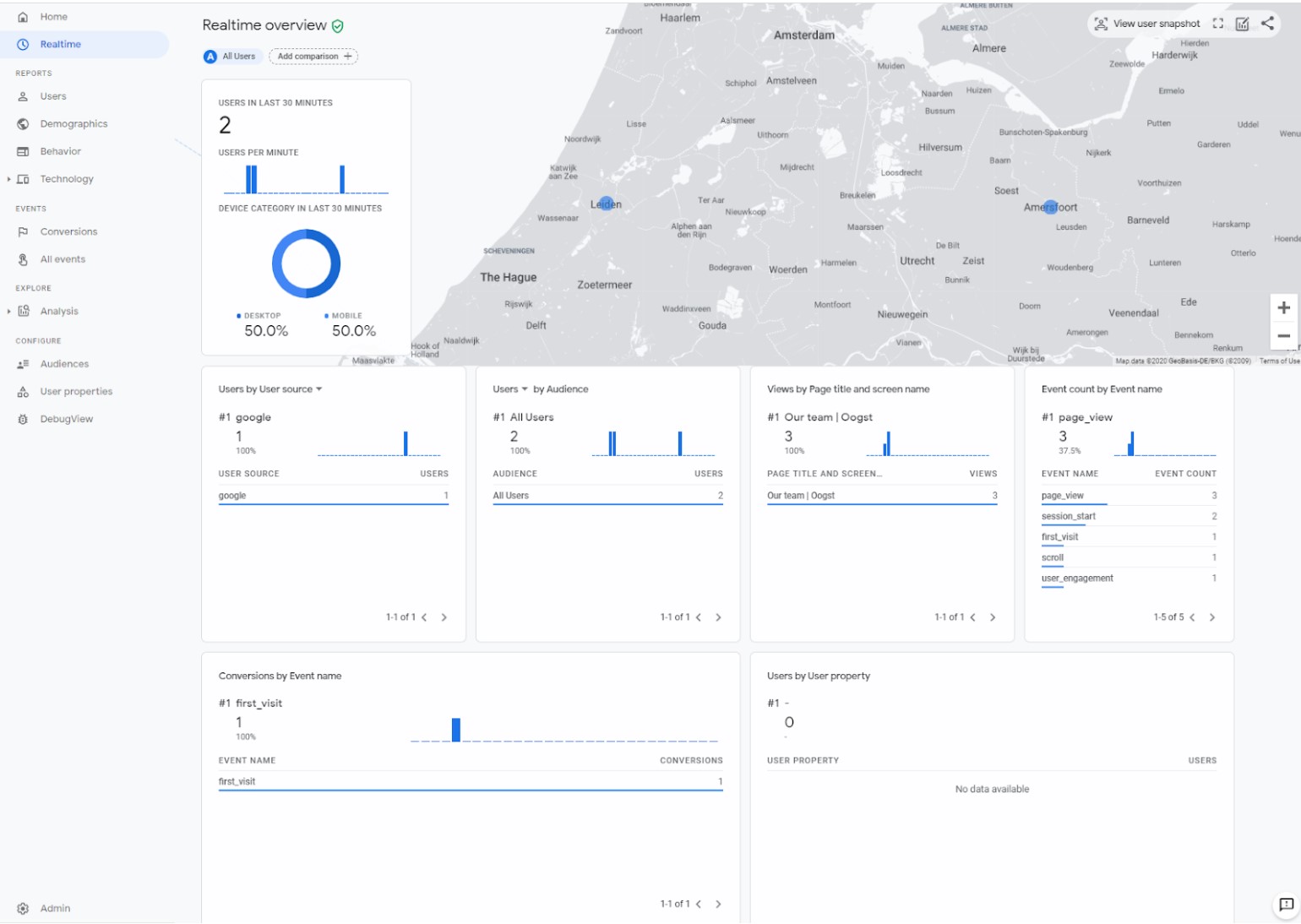 - Real-Time: een realtime overzicht van wat er nú gebeurt op je website en/of app;