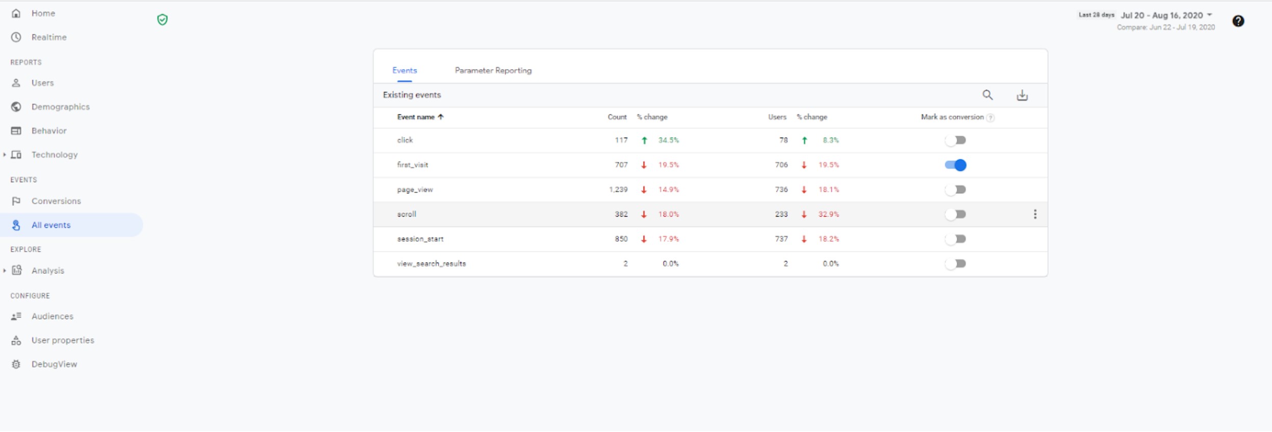 - Events: een overzicht van geregistreerde events en parameters. Verder de plek om conversies in te stellen;