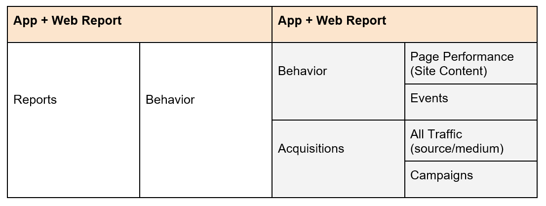 Binnen het behavior-rapport mist daarnaast ook het site-searchrapport. Mogelijk worden dit rapport later nog toegevoegd. Eventueel kan je met gebruik van custom events en parameters deze data in App + Web krijgen.