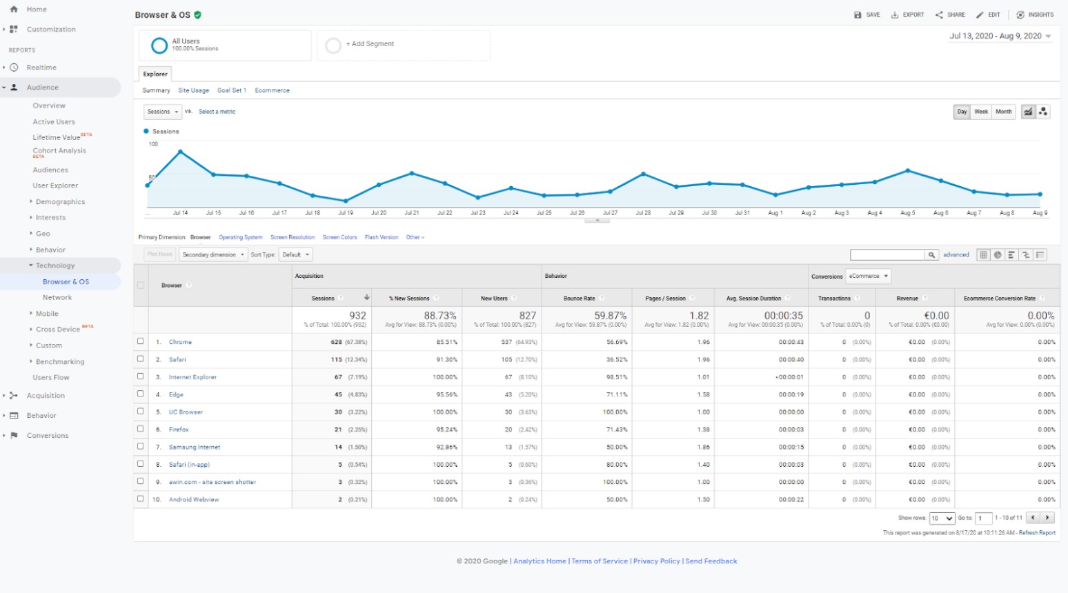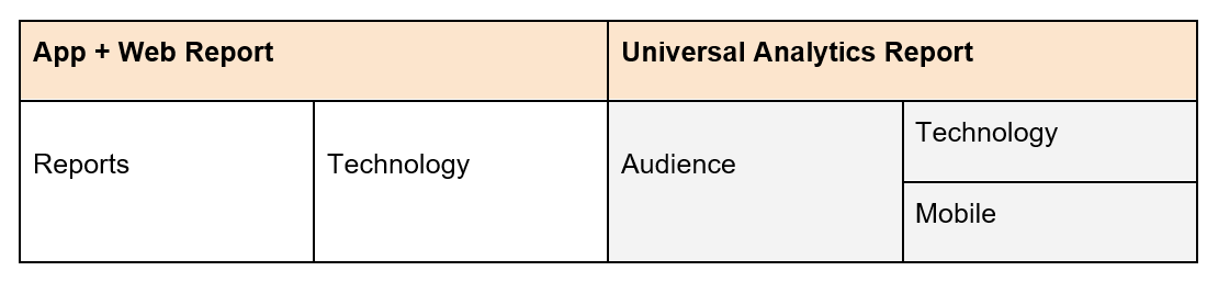 De technology- en mobile-rapporten die we kennen van UA zijn in App + Web samengevoegd in het technology-rapport. Binnen dit rapport vind je onder andere data over het apparaat, de browser en het operating system (OS) dat gebruikers gebruiken en hoe de performance hiertussen verdeeld is. Binnen App + Web is er een apart rapport voor zowel je website als voor je app. Wanneer je alleen een datastream voor je website hebt ingesteld, dan is alleen het website-rapport beschikbaar.