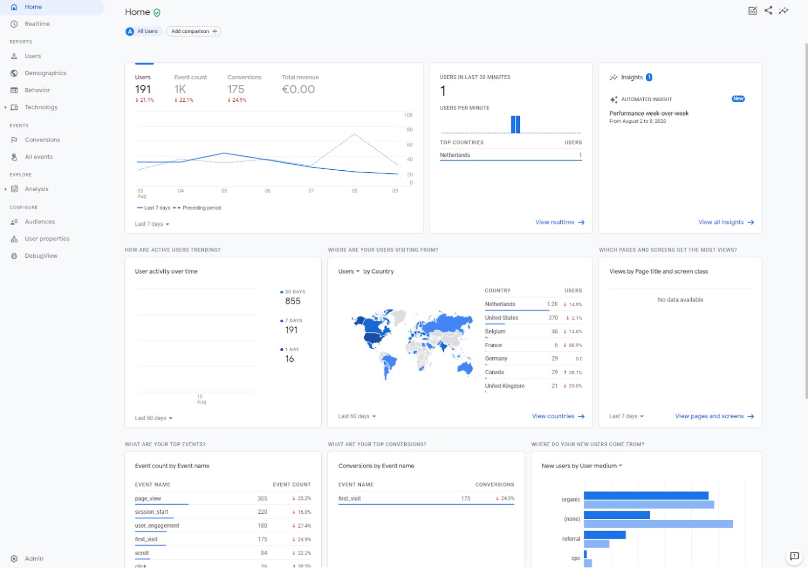 - Home: een overzicht van de belangrijkste trends op je website en/of app;