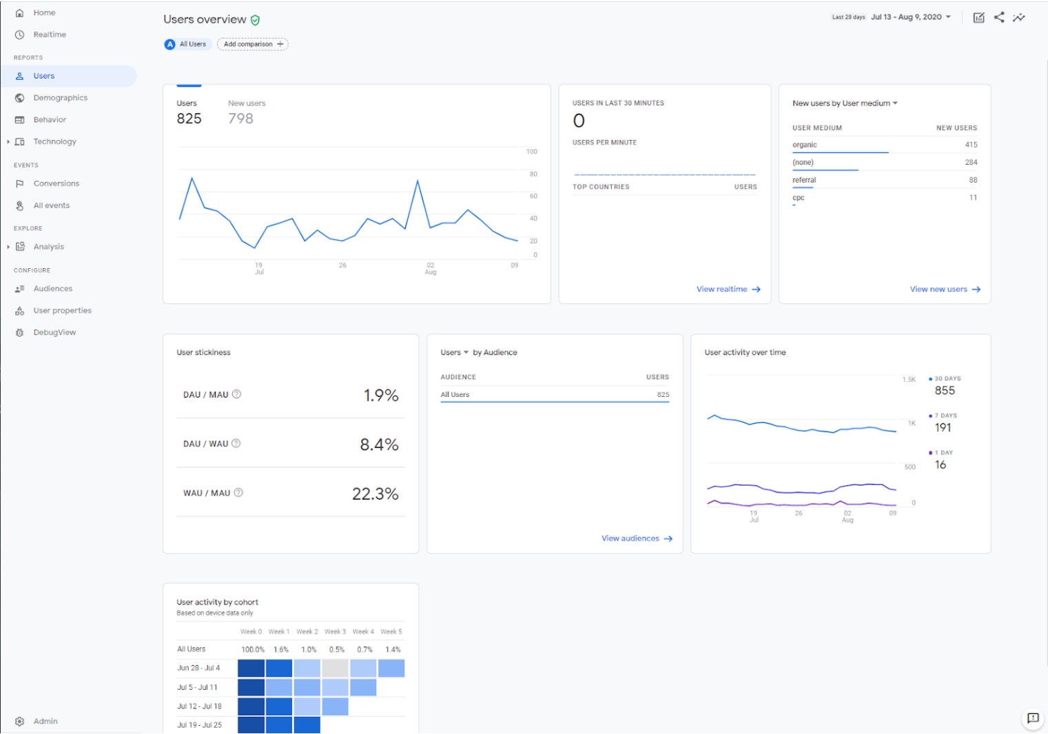 - User Stickiness. Om de terugkerende gebruikers beter te kunnen begrijpen zijn in App + Web de metrics DAU (daily active users), WAU (weekly active users) en MAU (monthly active users) toegevoegd. Met deze metrics kun je bijvoorbeeld beter in kaart brengen in welke mate het aantal gebruikers dat dagelijks je website of app gebruikt zich verhoudt tot het aantal wekelijkse en/of maandelijkse gebruikers. Tezamen met het cohort-rapport kun je vervolgens interessante inzichten opdoen over de ‘stickiness’ van je gebruikers.