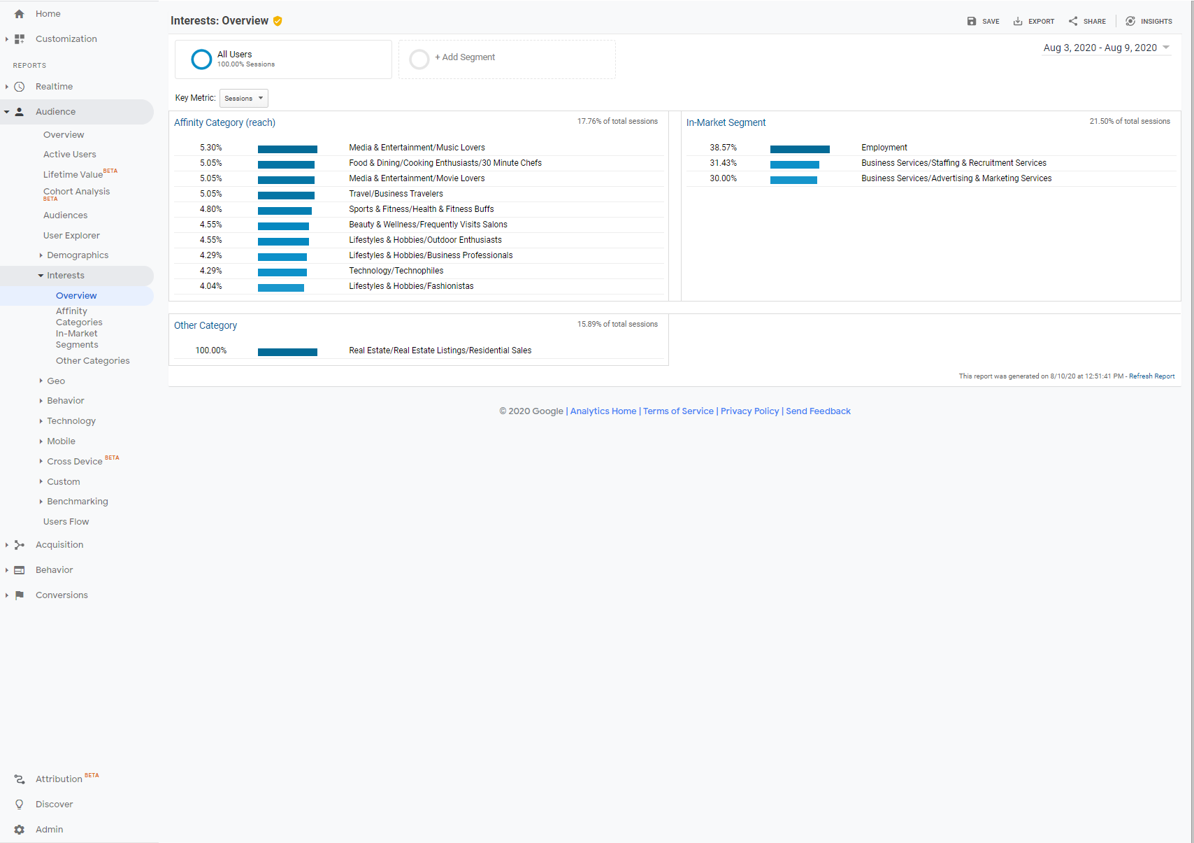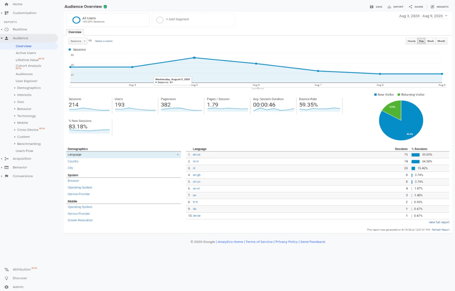 Dit is een grote verbetering ten opzichte van de ‘droge’ datatabellen die vaak te zien waren in UA. De reportsectie is onderverdeeld in vier subsecties: 1) users, 2) demographics, 3) behavior en 4) technology.